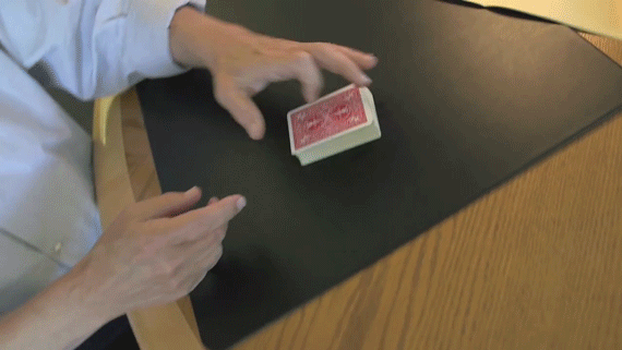 this is the method where you split the deck roughly in half and then snap the cards together, alternating cards from the two halves. in this method, since you are alternating the cards each time, you can mathematically predict the level of randomness quite accurately. one of the key pieces here is that, while alternating between halves, sometimes more than one card drops from a single half at one time, thus not perfectly toggling from one half to the other. if you did perfectly split the deck in half (26 cards per half) and then perfectly alternated between the halves, you would actually return to the exact same deck order in 8 shuffles! this is a magic used by some card sharks to cheat.